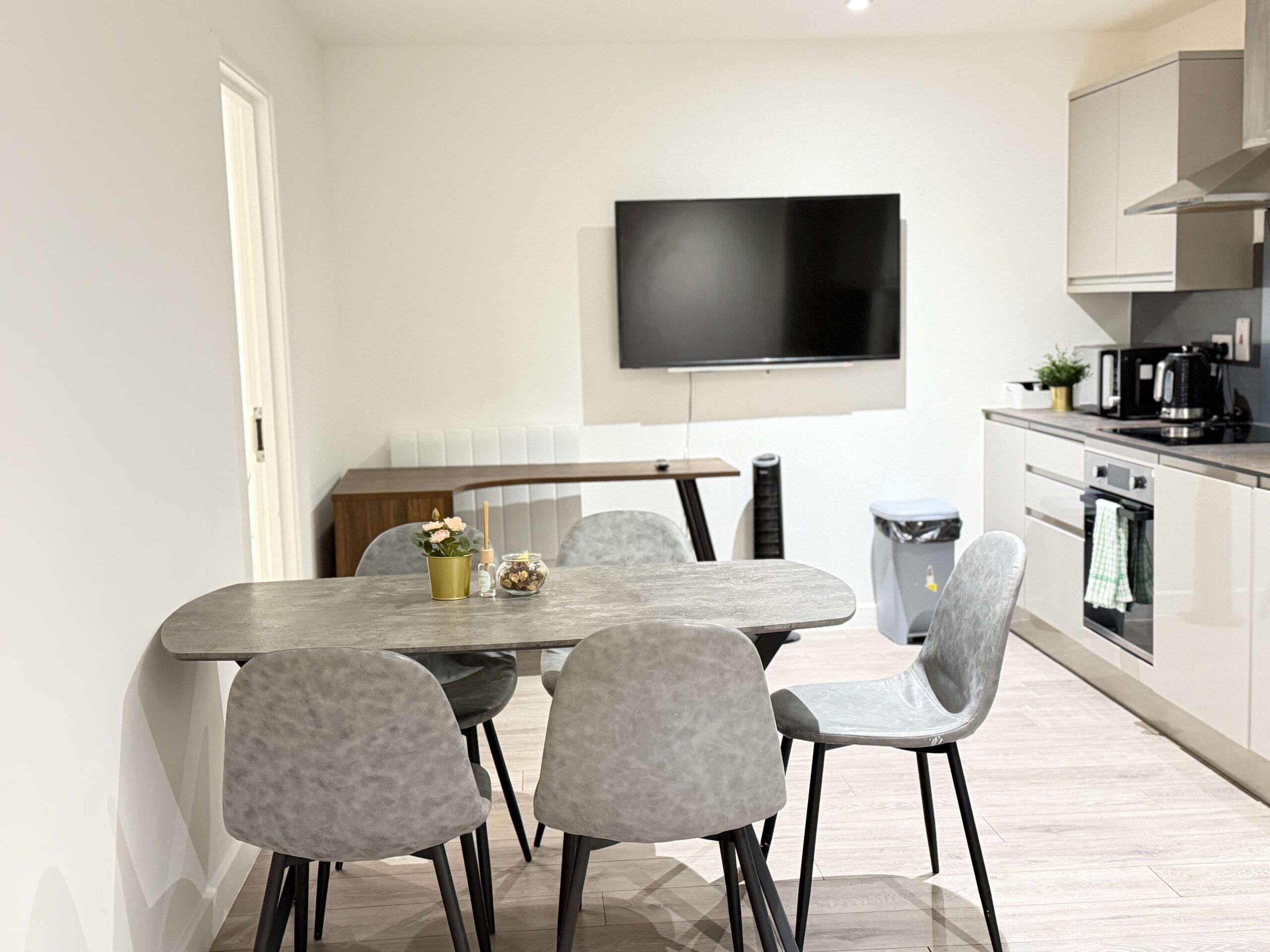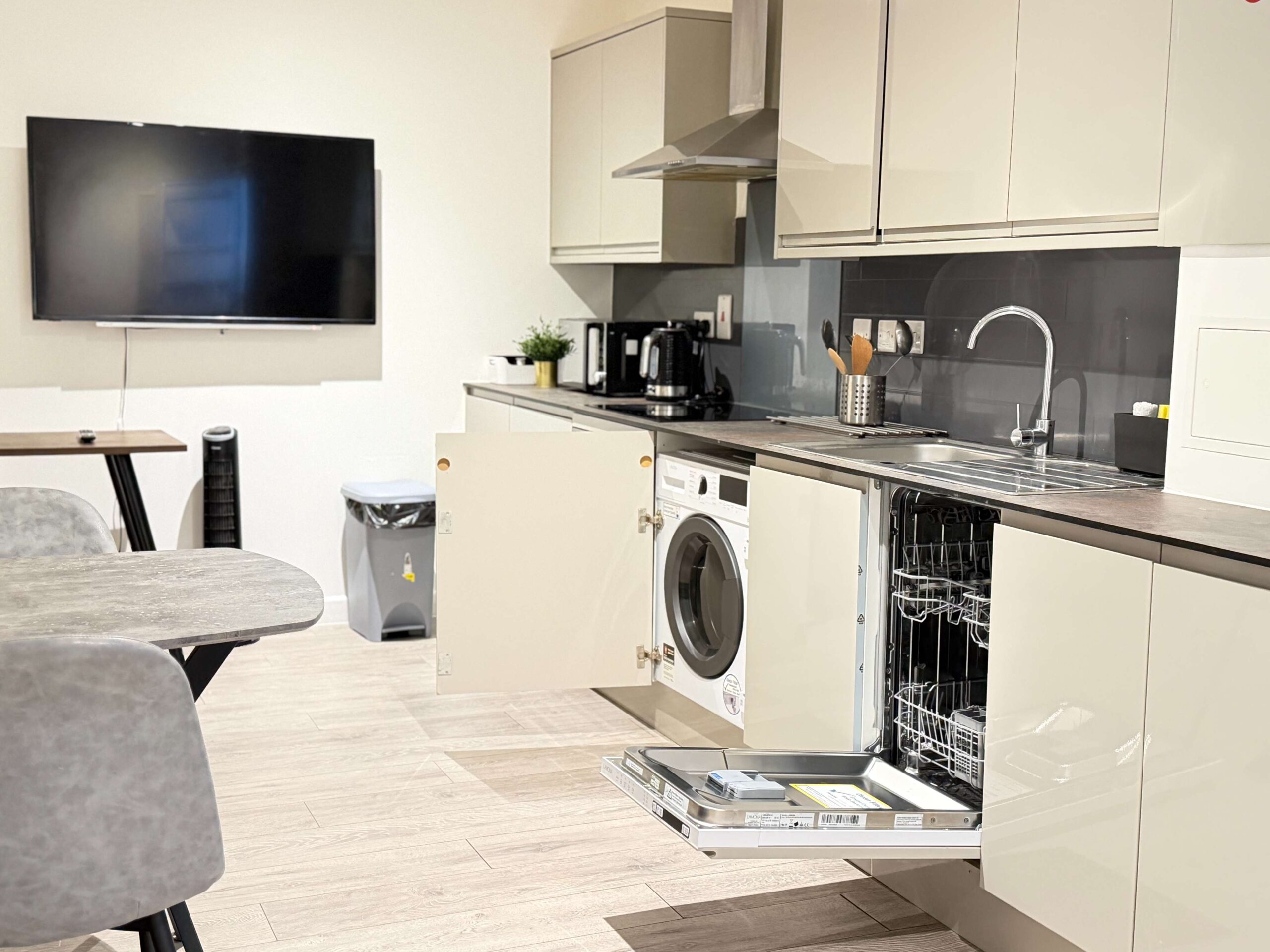 This apartment features two bedrooms with single beds and one bedroom with a double bed, as well as a bathroom with a walk-in shower and complimentary toiletries. The kitchen is fully equipped with a stovetop, refrigerator, dishwasher, and kitchenware, providing everything needed to prepare and enjoy meals. Additional amenities include tiled floors, a flat-screen TV, and a washing machine.